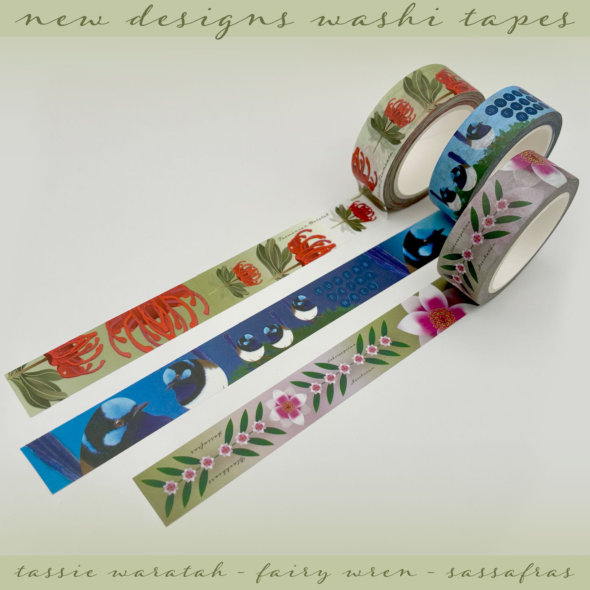 Three styles of 15mm x 10m Washi Tapes designed in Nipaluna and featuring stunning vector illustrations of Lutruwitan Native Species: Tasmanian Waratah/Telopea truncata, Superb Fairywren & Blackheart Sassafras/Atherosperma moschatum. Please leave a note for which style or styles you would like to receive.